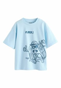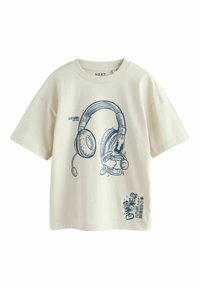 Trīs grafiskās T-krekli: sarkans krekliņš ar galvaskausa dizainu, krēmkrāsas krekliņš ar austiņu attēlu un gaiši zils krekliņš ar spēļu konsoles kontrolieri.