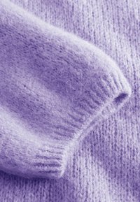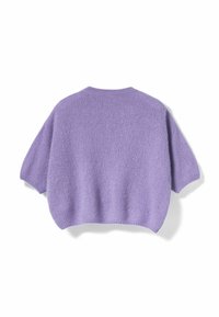 Lavandas krāsas īsroku džemperis ar apaļu kakla izgriezumu, mīkstu, pūkainu tekstūru un brīvu piegriezumu, izklāts uz balta fona.