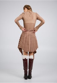 Sieviete ar gariem matiem, tērpusies brūnā adītā topā, krēmkrāsas svārkos, pie jostas sasietā pleda kreklā un tumši brūnās zābakos līdz ceļiem, rokās turot mazu pīti somiņu.