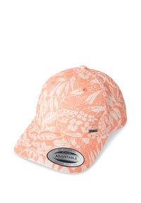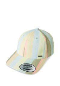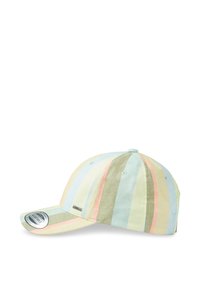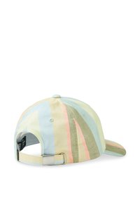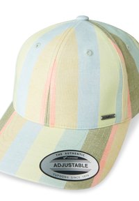 Svītrains cepure pasteļu krāsās ar izliekto malu. Izceļas ar horizontālām svītrām zilā, rozā un zaļā krāsā. Sānos redzama etiķete.