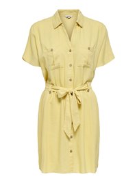 Sieviete valkā īsroku tumši zilu kleitu ar pogām un krūšu kabatām, ar auduma jostu sasietu viduklī, stāvot pret vienkāršu fonu.