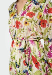 Sieviete valkā vieglu ziedu raksta kleitu ar garām piedurknēm, V veida izgriezumu, pakāpienveida apakšmalu un atbilstoša auduma jostu, kas sasieta viduklī.