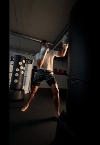 • Boxo treniņš, kurā redzams cilvēks ar sudraba boksa cimdiem, baltu krekliņu un melniem šortiem, sitot melno boksa maisu.