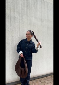 • Jūras zilas denima jaka ar apkakles kakla izgriezumu, pogu aizdari un svītrainām piedurknēm; eleganta brūna somiņa; mati augstā ponijā.
