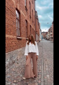 Bēšs īsām piedurknēm tops kopā ar baltām platām biksēm, kas aprīkotas ar sānu kabatām, papildināts ar gaiši pelēkām kurpēm, fona attēls - ķieģeļu siena.