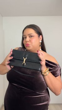 • Tumši brūna, samta kleita ar atsegtiem pleciem un piegulošu siluetu, kombinēta ar melnu rokassomiņu un smailu papēžu kurpēm. Gluda faktūra, vidēja garuma.