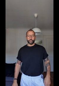 Vīrietis ar bārdu un noskūtām matiem, ģērbies melnā jakā, saulesbrillēs un leopardu raksta biksēs, stāv pretī netīram bēša krāsas sienai brīvā dabā.