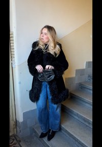 • Melnā kažokāda ar kažokādas oderi un teksturētām aprocēm, nēsāta virs zilām platajām džinsa biksēm un melnām potīšu zābakiem, stāvot uz kāpnēm ar teksturētu sienu.