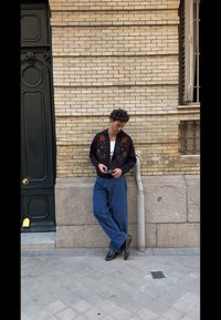 • Melna kardigāna ar ziedu izšuvumu, balts topiņš, augstā jostasvietā zilas džinsas un melnas kurpes. Stāv blakus teksturētai sienai un notekcaurulei.