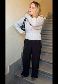 • Melnas vilnas virsjaka ar piegriezumu, garām piedurknēm un vienu pogu, kopā ar melnu blūzi un platām biksēm.