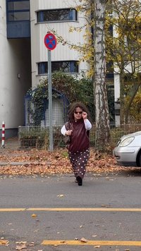 • Vīnogu krāsas mākslīgās ādas veste, balta krekla ar garām piedurknēm, brūna punktainā svārki, tumši sarkani zābaki un rakstaina soma uz akmens kāpnēm.