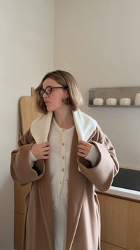• Gara, pārāk liela brūna mētelis ar baltu apkakli, valkāts pāri gaišai kleitai. Gluda auduma ar plašām piedurknēm, stāv minimālistiskā virtuvē.