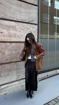 • Browna zamšā jaka virs baltas blūzes, saskaņota ar melnu plīša maksi svārku un melniem potīšu zābakiem. Melna rokassomu un saulesbrilles papildina izskatu.