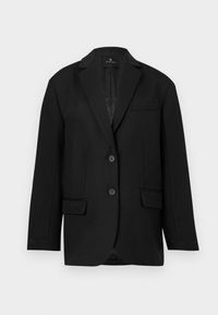 Melnas pārmērīgs bleizeris, balta satīna svārki un kailas augstpapēžu kurpes. Fons raksturo baltu sienu un zaļumus augšpusē.