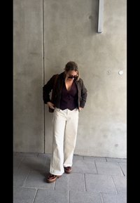 • Brūns zip-up bomber jakas ar tumši burgundijas svītrainu vestīti ar pogām, savienots ar baltajām biksēm. Audumam ir gluda tekstūra.