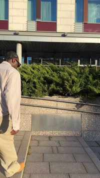 • Vīrietis ar saulesbrillēm un bēša krāsas svītrainu kreklu tur rokā burbuļtēju ar salmiņu, stāv ārā pie augiem un ēkas.
