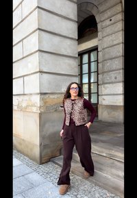 • Brūni plaša kāju bikses, bordo garām piedurknēm tops, leoparda raksta veste. Brūnas potīšu zābaki, maza bordo rokassoma ar zelta akcentiem.