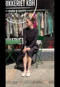 • Sieviete melnā kleitā sēž zaļā metāla krēslā ārpus dzijas un kafijas veikala, aiz viņas logā ir izliktas adītas džemperi.