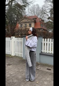 • Pelēka saīsināta džemperis ar garām piedurknēm, kopā ar gaiši pelēku adītu šalli un tumšpelēkām džinsiem. Fonā redzama māja un koki.