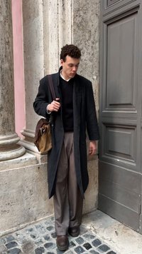 • Melnas vilnas virsjakas pārklājums virs melna džempera, apvienots ar pelēkām platām biksēm. Brūna ādas sūtījumu soma ar auduma ķermeni un brūniem akcentiem.