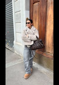 • Pelēks mākslīgās kažokādas mētelis ar platu apkakli, valkāts virs pelēka džempera. Tumšs ādas rokassomiņa ar misiņa detaļām atrodas uz rokas, demonstrējot mīkstu tekstūru.