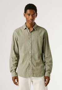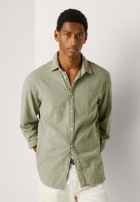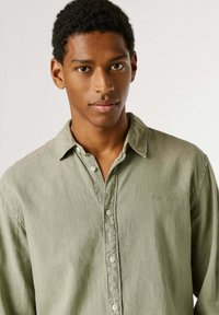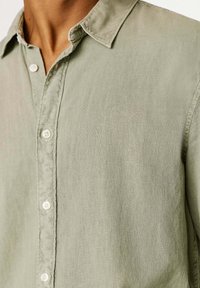 Jauns vīrietis ar īsiem cirtainiem matiem, valkājot neaizpogotu gaiši olīvu krāsas kreklu un baltas bikses, stāv pie vienkāršas sienas.