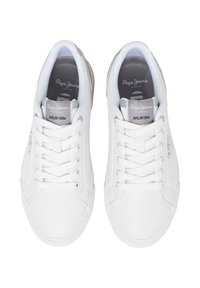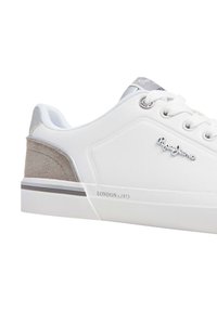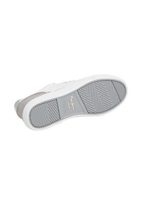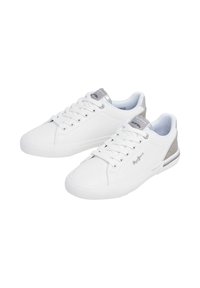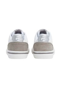 Balta zema profila sporta apava ar šņorēm, bēša zamša papēža uzlika, sudraba logotips sānos un pelēkas detaļas uz mēlītes un zolēm, skats no sāniem.