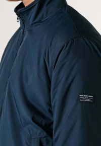Tumši zils bomber tipa jaciņa ar rāvējslēdzēja aizdari priekšpusē, ribotām aprocēm un augstu apkakli, valkāta pār džinsa kreklu. Izgatavota no mīksta, gluda materiāla ar brīvu piegriezumu.