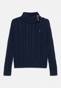 Krēmas krāsas adīts džemperis ar augstu, salocītu apkakli, kuram ir četri pogas uz pleca un ribotām piedurknēm un apakšmalu.