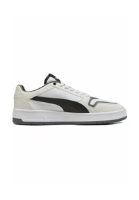 Zema auguma Puma sporta apavi baltā un pelēkā krāsā ar melnu logotipa svītru, baltiem šņorēm un mīkstinātu zolīti uz vienkārša balta fona.