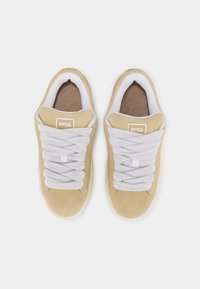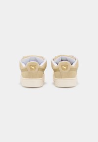 Zemās zolītes bēšas zamšādas Puma kedas ar baltām šņorzēm, Puma logotipu sānos un baltu gumijas zoli uz vienkārša fona.