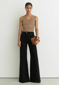 Tan bezroku tops ar V veida izgriezumu, kombinēts ar melnām, augsti pieguļošām biksēm ar zvana piegriezumu. Vienā rokā tur mazu brūnu somiņu ar austu siksnu.