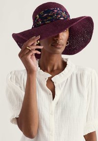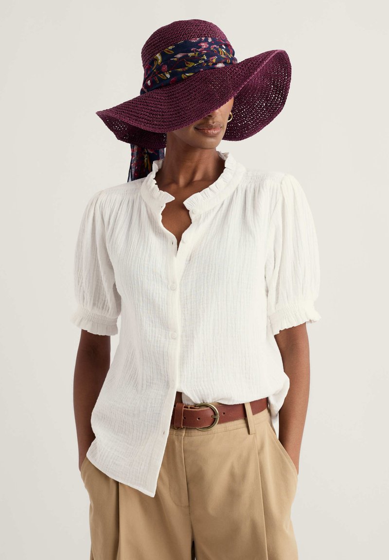 Sieviete valkā bordo krāsas plaša apaļa cepuri ar ziedu šalli, baltu teksturētu blūzi ar volānu apkakli, bēšas bikses un brūnu jostu.