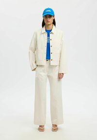 Sieviete zilā cepurē, zilā T-kreklā ar baltu veikala veikala skici un plaša silueta gaišos biksēs, stāvot ar muguru pret baltu fonu.