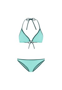 Korālu bikinis, kurā ir trīsstūra formas tops ar viļņotiem malām un regulējamām siksnām, kopā ar zemu vidukli un saitēm sānos. Gluda tekstūra.