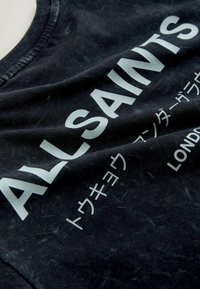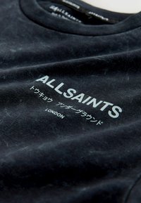Tumši zila kokvilnas T-krekls ar strukturētu apdari, īsām piedurknēm, apaļu kaklu un uz krūtīm zaļā krāsā izdrukātu “ALLSAINTS” logotipu.