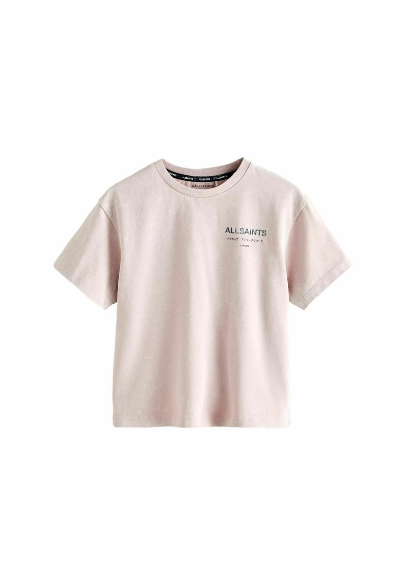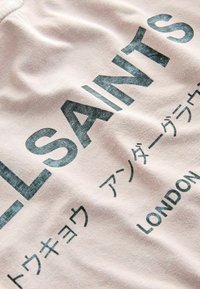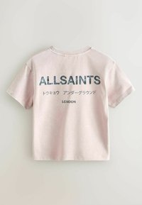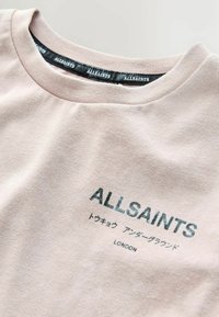 Gaiši rozā T-krekls ar īsām piedurknēm, uz kreisās krūšu daļas uzdrukāts „ALLSAINTS” un japāņu valodas teksts.