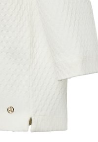 Balts rakstains tops ar dimanta rakstu, laivas formas izgriezumu un īsām piedurknēm. Ikdienas piegriezums ar gludu iekšējo oderējumu.