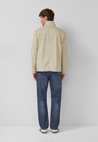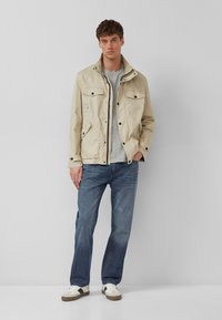 Jauns vīrietis valkā bēša krāsas jaku ar pogām un kabatām, ģērbies pelēkā krekla un zilās džinsu biksēs, stāvot pret vieglu vienkrāsainu fonu.
