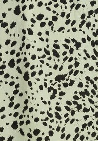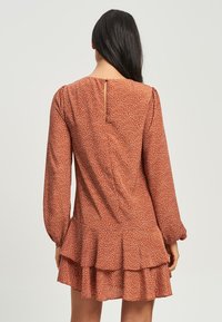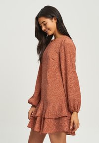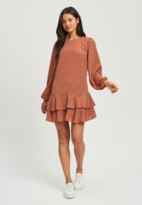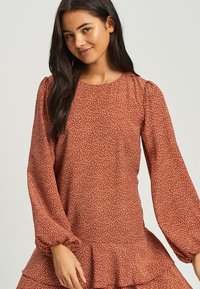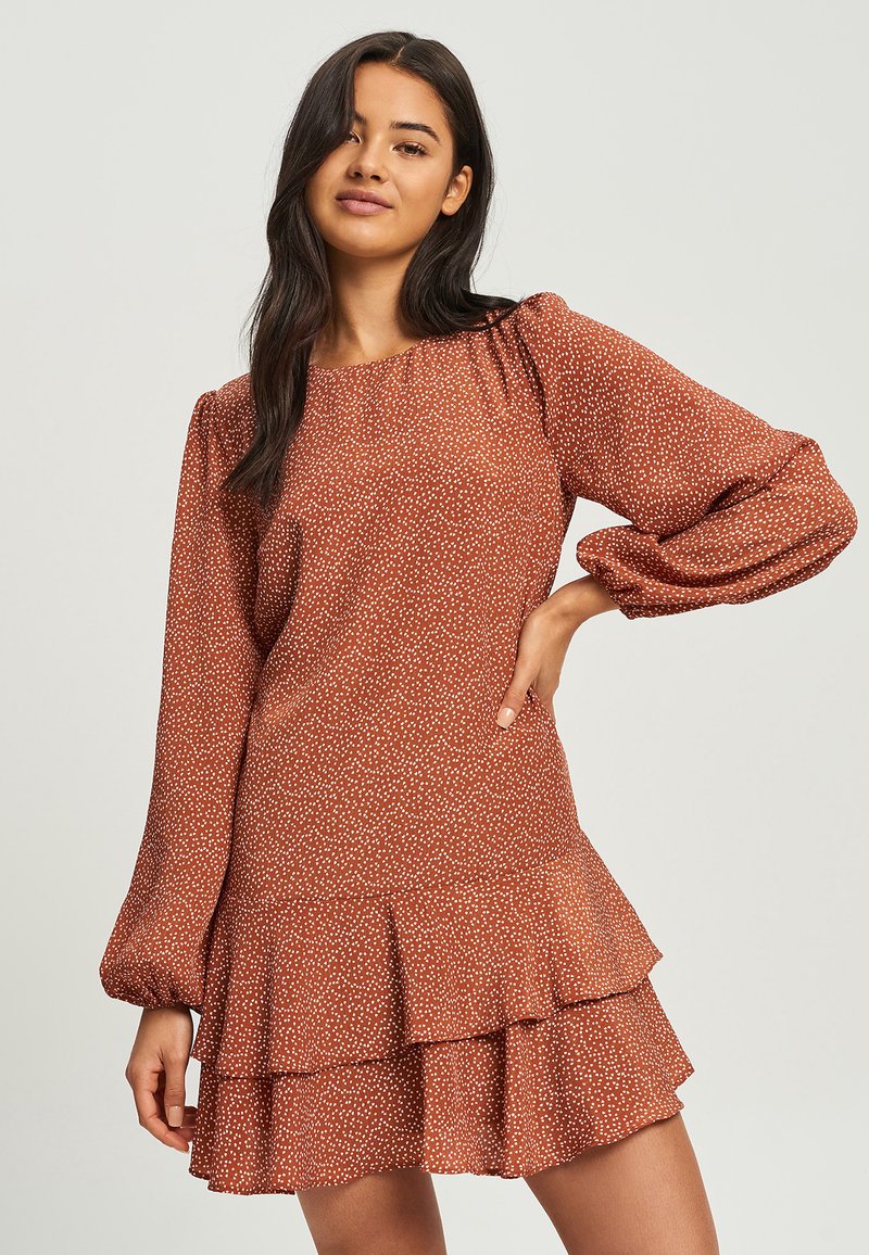 Brūna rakstaina kleita ar garām puffed piedurknēm un pakāpenisko ruffles apakšmalu. Izgatavota no vieglas auduma ar baltām plankumiem visā virsmā.