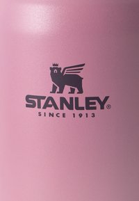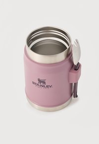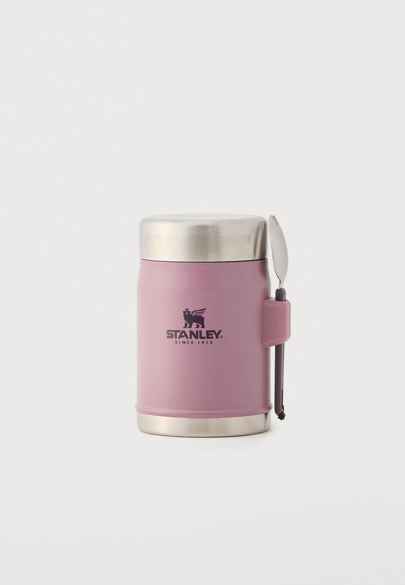 Rozā nerūsējošā tērauda vakuuma pārtikas burka ar sudraba vāciņu, pievienotu salokāmu karoti un "Stanley" logotipu priekšpusē.