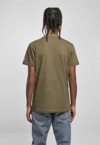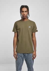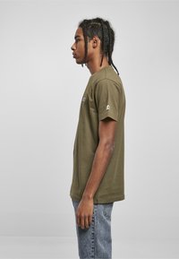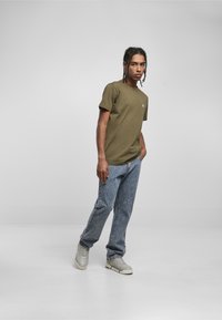 Jauns vīrietis ar bizēm, tērpts olīvzaļā T-kreklā un zilās džinsās, skatoties profilā pret vienkāršu pelēku fonu.