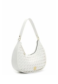 Balta austas ādas soma ar izliektu formu, vienu plecu siksnu, noņemamu plecu pār plecu siksnu un zelta kvadrātveida logotipa plāksni priekšpusē.