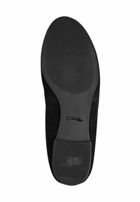 Melnas zamša sieviešu baleta dzīvokļapavi ar nelielu loku uz pirksta un zemu papēdi, skatīti no sāniem uz baltas fona.