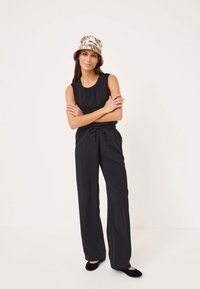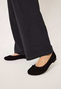 Melni zamšas balerīnes ar apaļu purngalu un mazu loku, kopā ar melnām platām biksēm, kas rāda gludu faktūru.