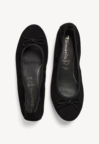 Melnas ādas baleta kurpes ar noapaļu purngali, dekoratīvu loku uz purngala un teksturētu priekšējo paneli; ir zema, elastīga zole.