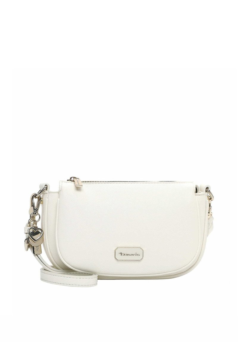 Balta ādas plecu soma ar sudrabotiem sirds formas piekariņiem un rāvējslēdzēja aizdari, zīmola Tamaris ar nelielu metāla logotipa plāksnīti.