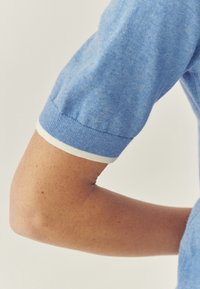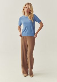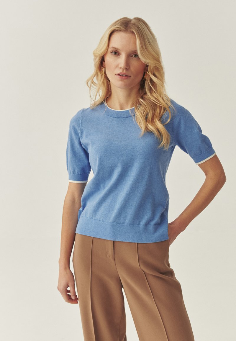 Zils īss piedurkņu džemperis ar apaļu kakla izgriezumu un kontrastējošām baltām malām, savienots ar brūnām augsta vidukļa biksēm.