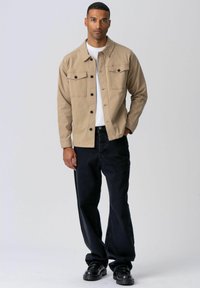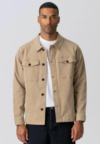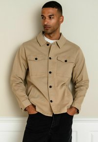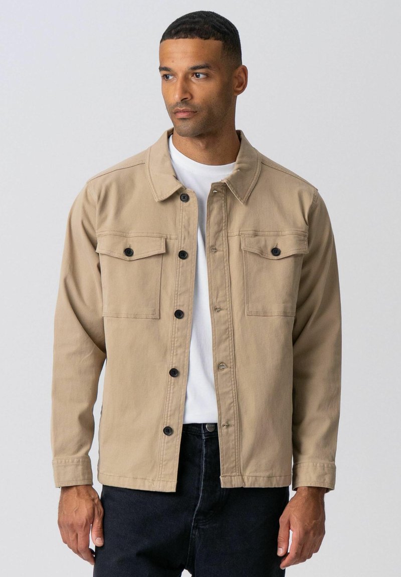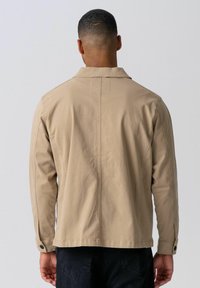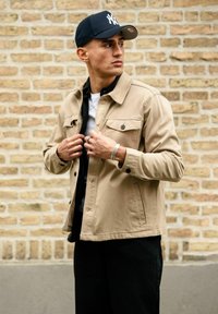 Vīrietis, kas valkā bēša krāsas pogājamu jaku pār baltu kreklu un melnas bikses, stāvot pret vienveidīgu gaiši pelēku fonu.