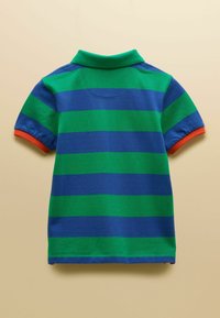 Īsām piedurknēm polo krekls ar plašām oranžām un krēmkrāsas horizontālām svītrām, zilām apmalēm uz piedurknēm un apkakles atloka, kā arī mazu zilu truša logotipu uz krūtīm.